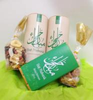 A unique Hajj Mubarak hamper consisting of two tubes of shortbread biscuits, a bag of dried tropical fruit, a bag of butter toffees and a 100g bar of personalised chocolate. Presented in a basket and gift wrapped. Please use the text box provided for the required name for the chocolate.