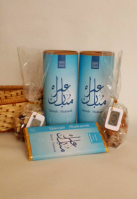 A wonderfully designed hamper in blue for anyone returning from Umrah. It consists of 2 tubes of biscuits (200g each), a bag of butter toffees, a bag of mixed dried fruits/nuts and a bar of chocolate (100g).