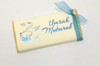 Personalised chocolate bar, showing Umrah Mubarak but can be made for any occasion and in any colour, with a matching ribbon and a diamanté to give it that extra special touch. Created from high quality milk chocolate. This personalised chocolate bars weighing 100g each (165 x 85 x 8mm). Gold inner foil and the outer wrapper can be made in any colour.