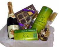 The hamper consists of one 750ml sparkling non-alcoholic drink, one 125g Belgian milk chocolate selection box, X1 200g tube of clotted cream shortbread biscuits, one 100g Belgian chocolate bar, one 100g bag of mixed dried fruits and one 100g bag of butter toffees