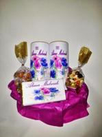 A unique Alima Mubarak hamper consisting of two tubes of shortbread biscuits, a bag of dried tropical fruit, a bag of butter toffees and a bar of chocolate. (Three items - two tubes of biscuits and chocolate bar will be personalised) Please use the text box provided for the name required. Please note one name will be used on all three items. All presented in a basket and gift wrapped.