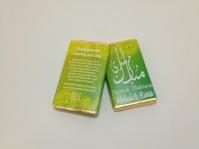 A yellow/green wrapper with a delicate paisley design running along the top and bottom. The message reads Mehndi Mubarak in Arabic. and on the back Thank you for sharing our day This design is also available in Nikah Mubarak, Manghani Mubarak etc.
