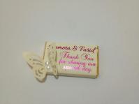 Foil printed cream background, the message Thank you for sharing our special day with couples names. Cream butterfly added with two diamanté\'s to add that extra sparkle.