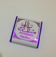 A unique personalised 5g milk chocolate favour. The inner foil is purple and the text is also foiled purple with either a cream or white background. This favour is available for any occasion.