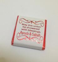 A unique personalised 5g milk chocolate favour. The inner foil is red and the text is also foiled in red with either a cream or white background. This favour is available for any occasion. The message on the favour reads \'may this union be showered with blessing. Ameen\'