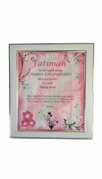 A silver bordered white, rectangular, baby girl frame which is personalised with name, meaning of the name, date and time of birth and weight of the child and finished with a lovely little duaa for the child.Size approx 8 by 10 inch.