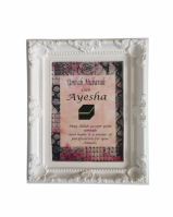 Small white frame. Personalised with name and date of umrah and ends with a small duaa.Ideal for any sister returning from Umrah. Size approx 6 by 4 inch. Please use the text box provided for name and date you require on the frame.